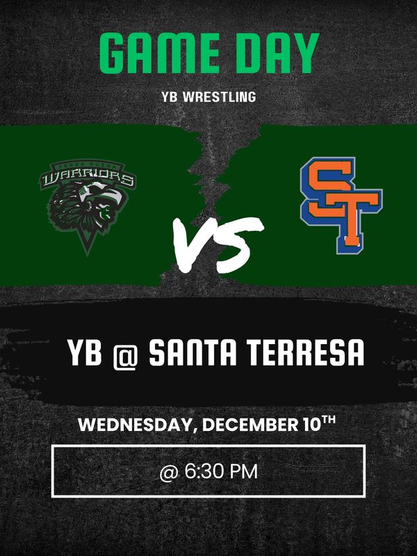 Hey Warriors! On Wednesday, December 10th, at 6:30 PM, our YB wrestling team will be facing off against Santa Teresa High School in an away match and their very first official match of the season! This will be a matchup against a league rival as both teams are in the Santa Teresa - East league. Last season, both teams finished with a losing record with Yerba Buena having a 1-4 record (5th place) and Santa Teresa with a 2-3 record (4th place). Both teams will be looking to make improvements from last year and compete to be on top of league rankings. This looks to be an opportunity for our Warriors to beat a team that was ranked ahead of us least season and show how much the team has improved and gotten better since. Our Warriors will win and show that we are not playing around this season.